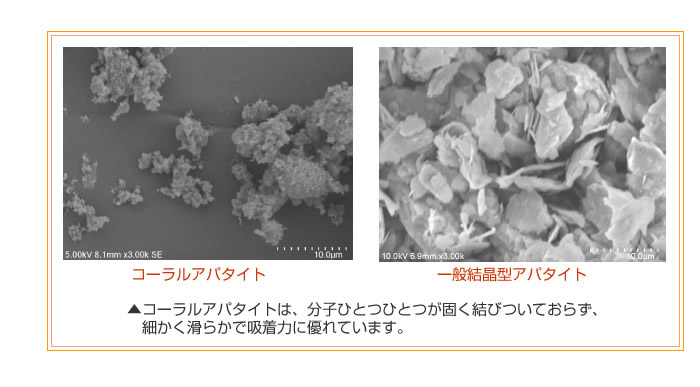 一方“コーラルアパタイト”は、与那国島の化石サンゴを由来とする希少な成分です。その特長は従来のアパタイトに比べるとミネラルが豊富なため、生体親和性に優れています。その分子は両性イオン交換特性を持ち、汚れの吸着作用にも秀でています。